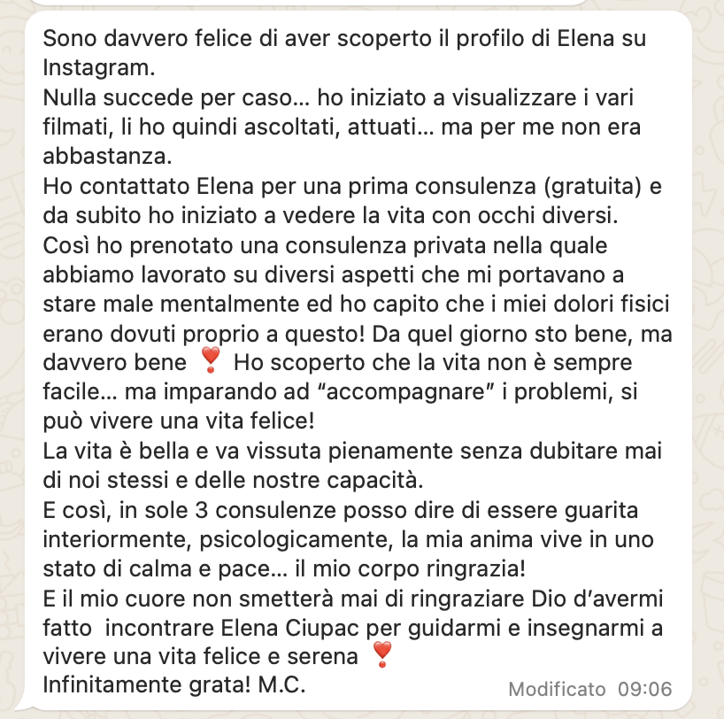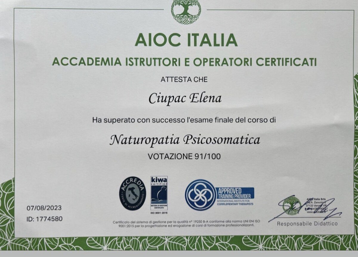 Sono Elena Ciupac, coach e naturopata psicosomatica. Aiuto le donne a riscoprire la propria forza interiore, migliorare la loro autostima e vivere una vita piena di amore per sé stesse